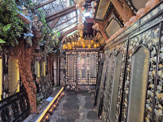 Overwhelming Interior: A unique, luxurious vibe created by ornate traditional mother-of-pearl cabinets and soft, warm lighting.