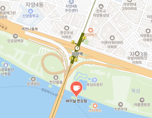 A 5-minute walk from Jayang Station Exit 1 toward Ttukseom Hangang Park.